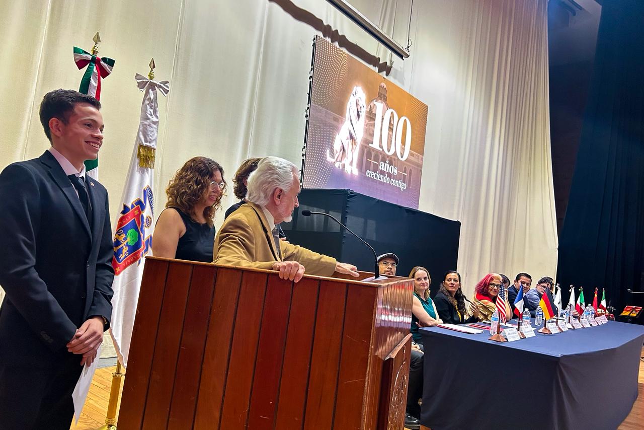 "Tenemos la colaboración con la UdeG desde 2008", señaló, refiriéndose al programa PASCH del Goethe-Institut, una alianza de 17 años que ha permitido consolidar con gran éxito la enseñanza del alemán. Basche, enfatizó que el aprendizaje de idiomas "nos conecta en un futuro no solo del idioma, sino de cultura, de mentes abiertas y que nos une en este mundo no tan unido" afirmó. Los estudiantes Ximena Nahid Reynoso Lopez y Diego Gael Gómez Cayó se dirigieron al público en alemán.